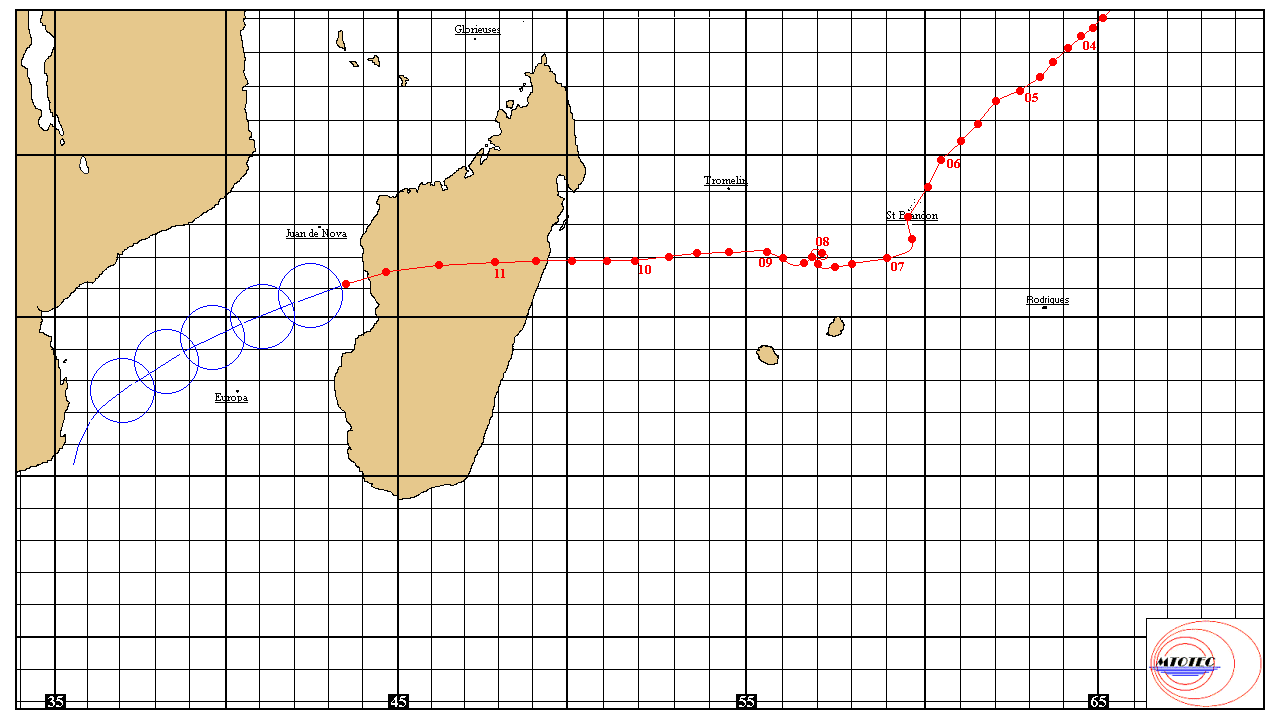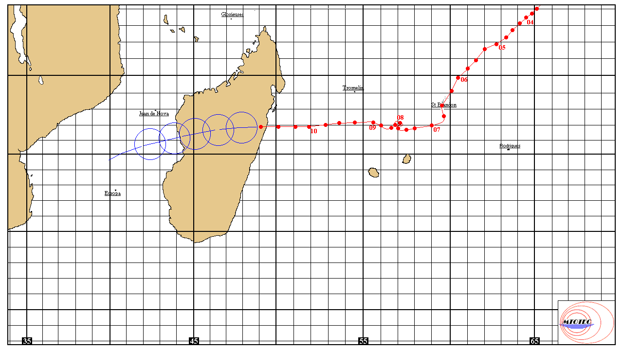 Position à 18h00 UTC : ~18,9° Sud – 43,5° Est, dans le Canal du Mozambique, au large de la côte ouest de Madagascar