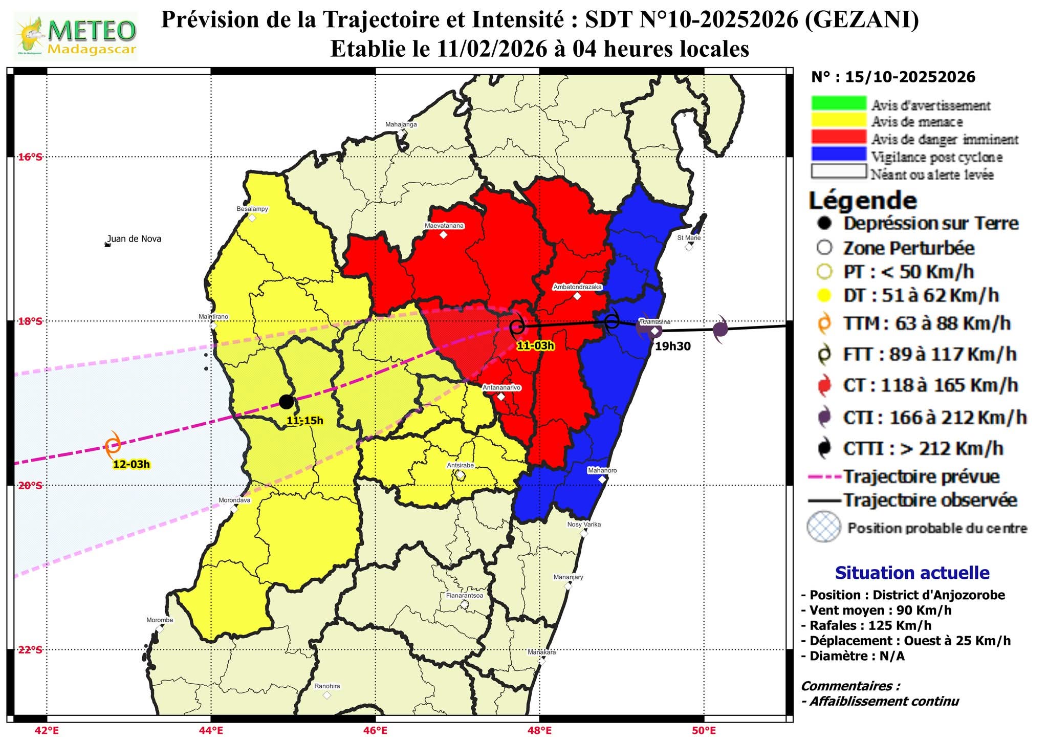 Son déplacement ouest-sud-ouest l’éloigne progressivement de Madagascar, mais des bandes périphériques humides peuvent encore influencer la façade ouest du pays (Melaky, Menabe, Atsimo-Andrefana).