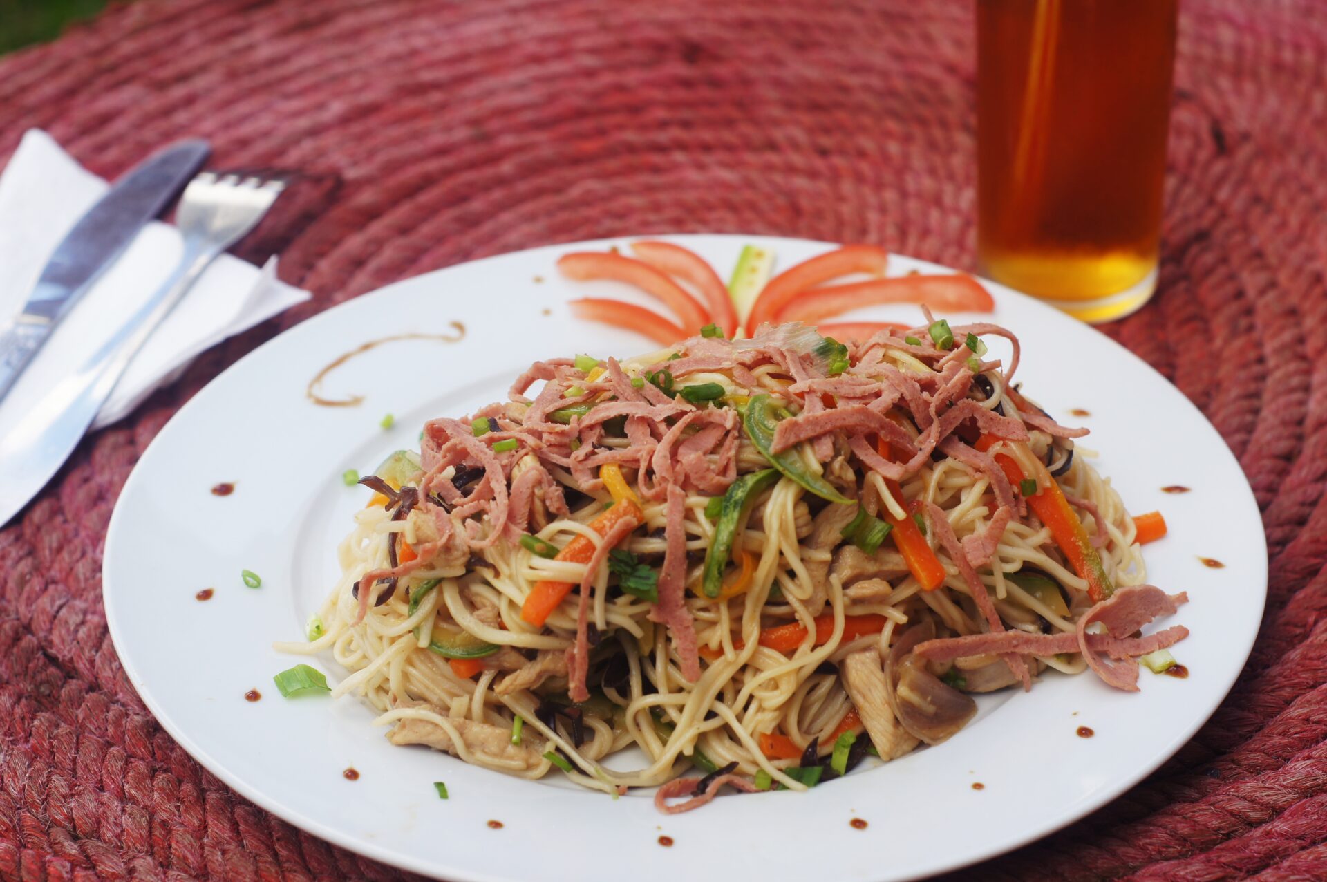 Ingrédients : Nouilles chinoises, Mortadelle, Courgettes, Carottes, Haricots verts, Epices de Madagascar, Oignon, Sauce soja, Huile, Sel et Poivre